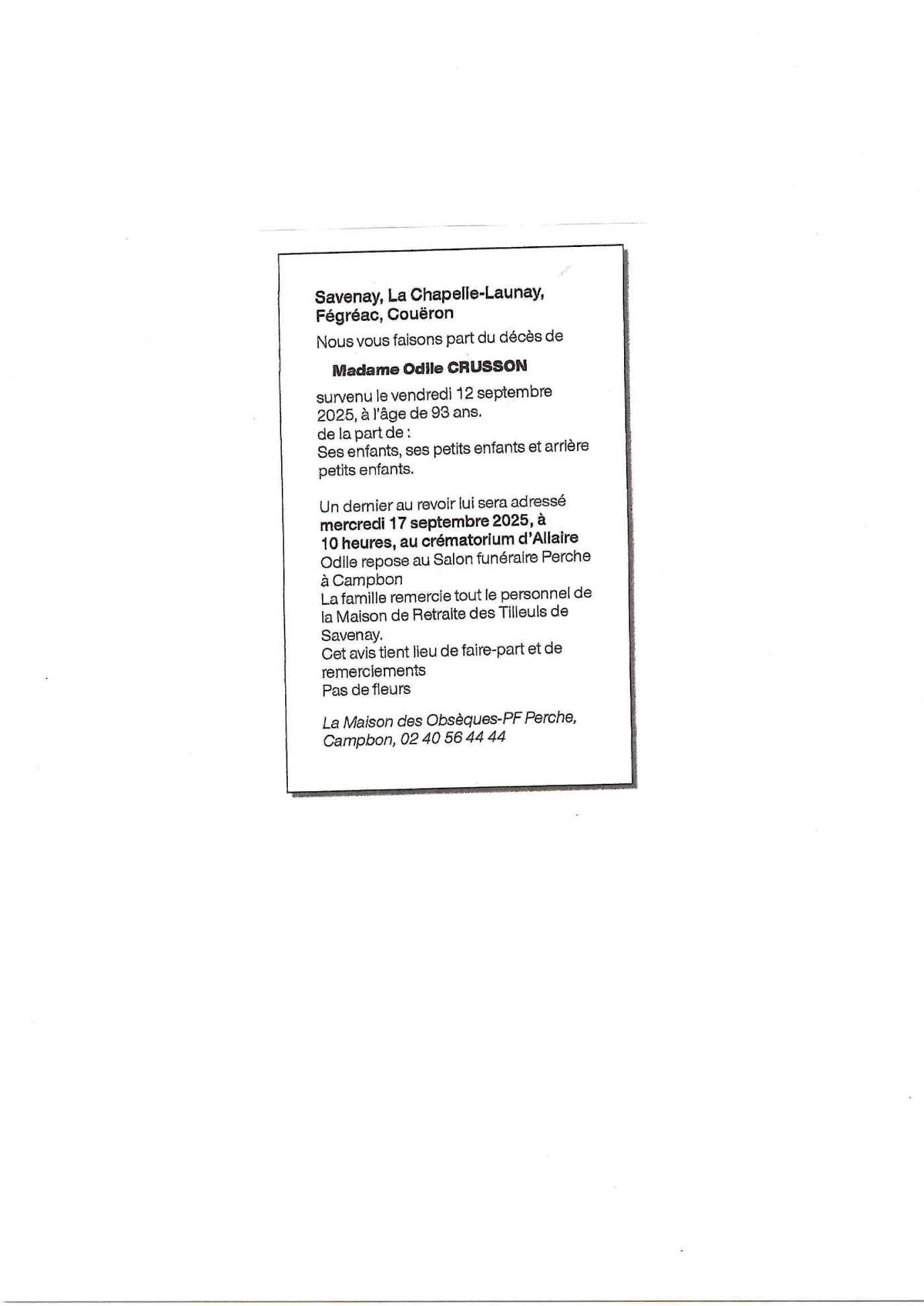Décédée à Savenay (44260, France) le vendredi 12 septembre 2025 à l'âge de 93 ans