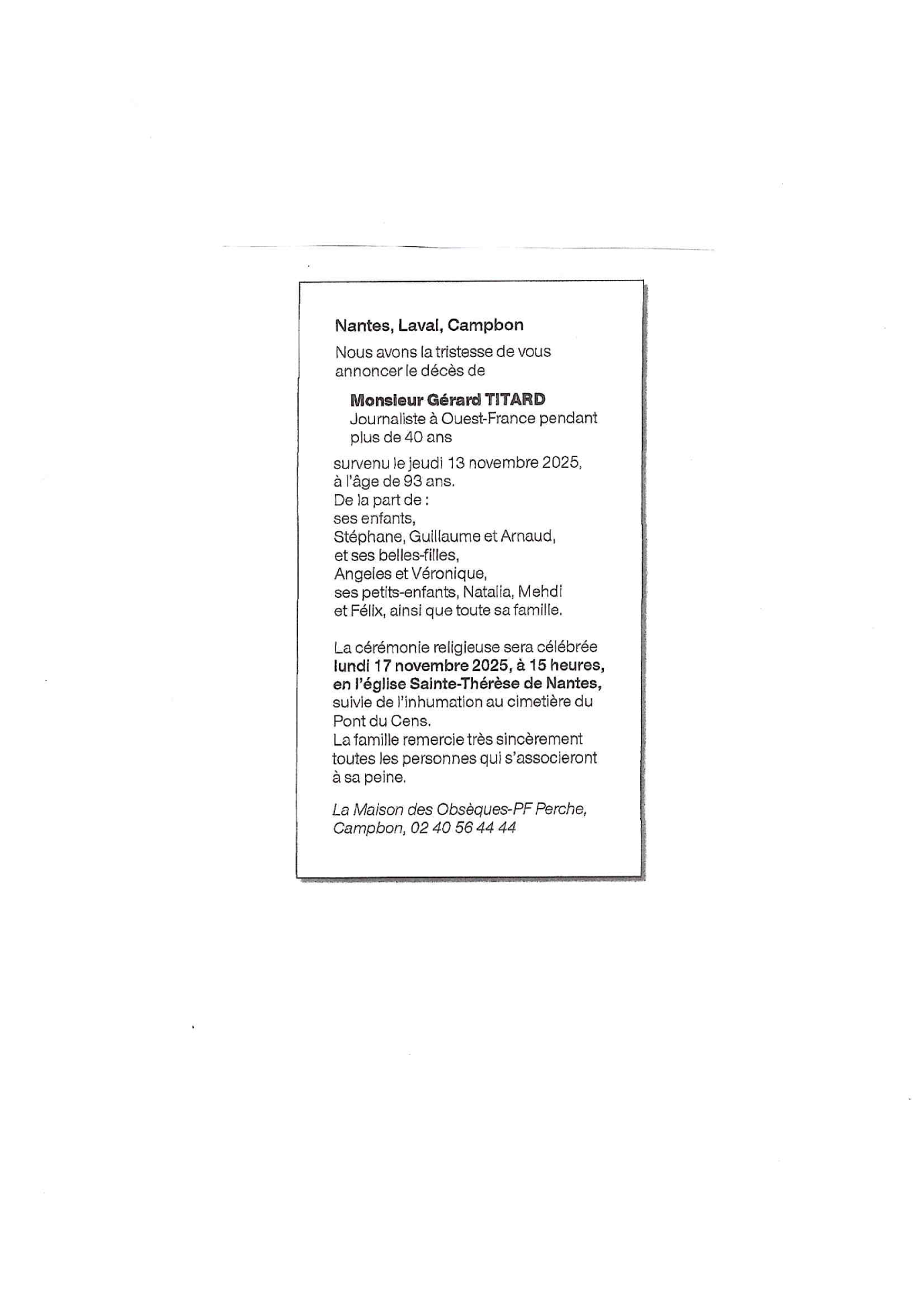 Décédé à Campbon (44750, France) le mercredi 12 novembre 2025 à l'âge de 93 ans