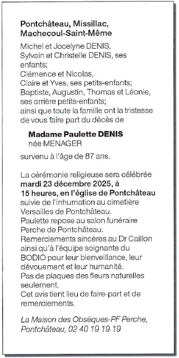Décédée à Pontchâteau (44160, France) le dimanche 14 décembre 2025 à l'âge de 87 ans