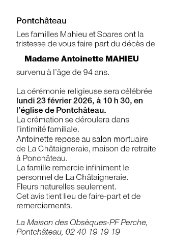 Décédée à Pontchâteau (44160, France) le lundi 16 février 2026 à l'âge de 94 ans
