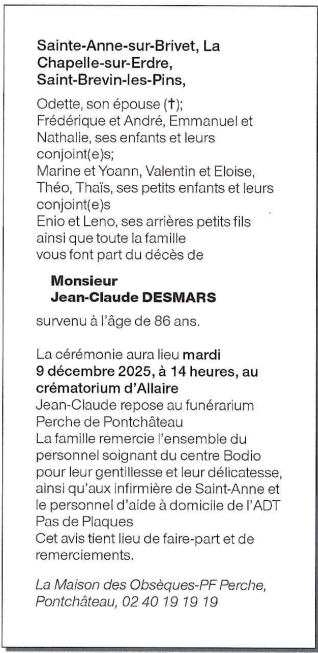 Décédé à Pontchâteau (44160, France) le jeudi 4 décembre 2025 à l'âge de 86 ans