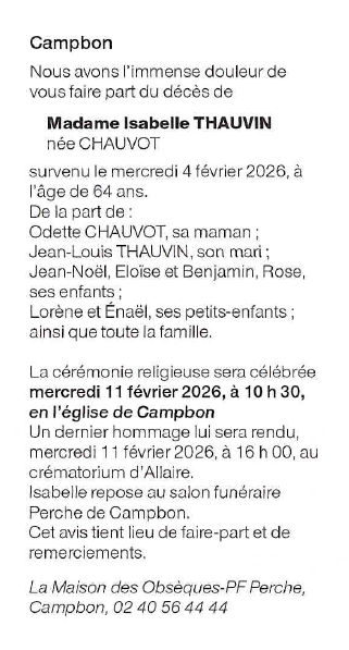 Décédée à Campbon (44750, France) le mercredi 4 février 2026 à l'âge de 64 ans