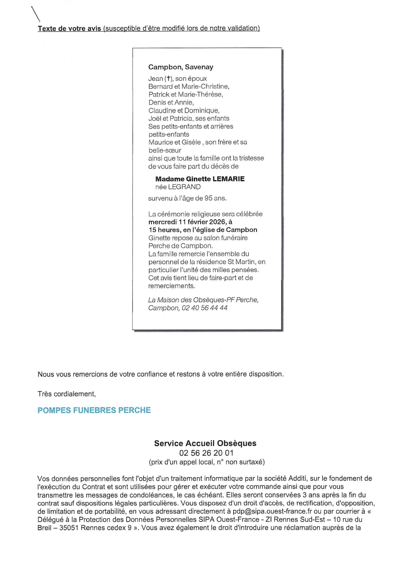 Décédée à Campbon (44750, France) le samedi 7 février 2026 à l'âge de 95 ans